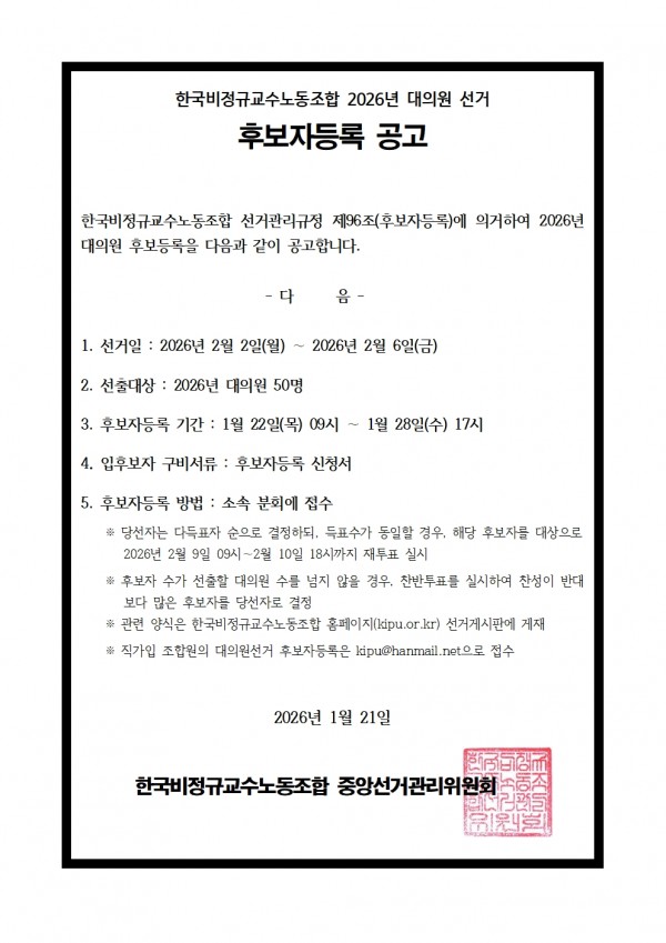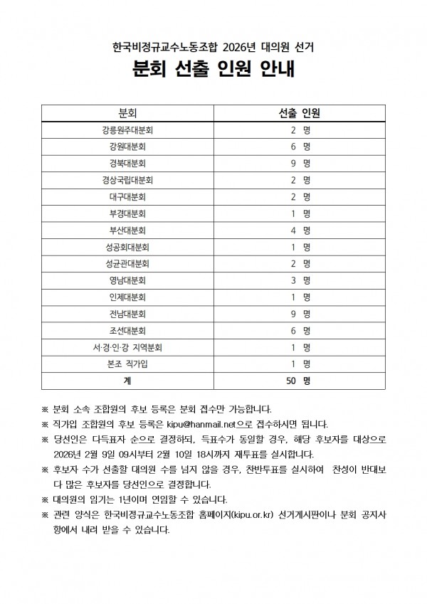 본조 2026년 대의원 후보자등록 공고